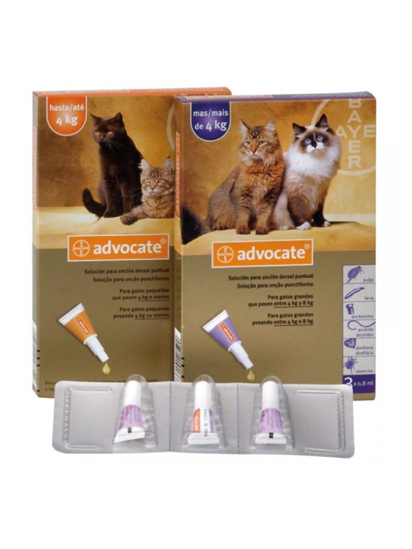 Antiparasitario interno y externo. Su modo de empleo es muy facil. Eficaz para el control y tratamiento de parasitos externos como la pulga e internos como los nematodos. Modo de empleo: tópico. Presentaciones: Para gatos pequeños hasta 4 kg. Para gatos grandes hasta 8 kg